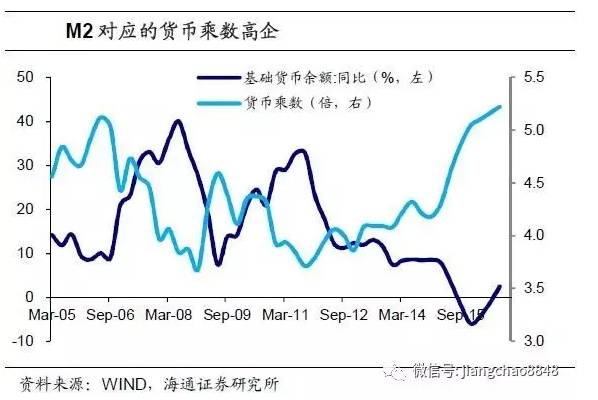 第一层从基础货币看,人民币贬值压力下,外汇占款流失对基础货币造成负面影响,依靠央行投放来补充货币缺口。14年末,我国基础货币余额在29.4万亿左右,15年811汇改后外占下降,对应15年末基础货币余额下滑至27.6万亿;16年在财政存款投放和央行大量流动性投放下,年末基础货币余额回到29万亿左右。但对应银行超储率仍低于2%,不及14-15年的水平,总体看,基础货币和超储难以大幅增加。