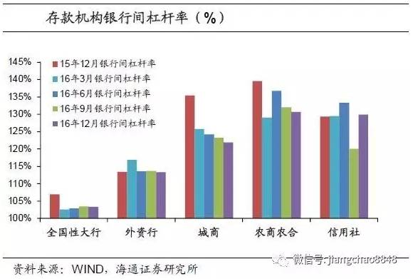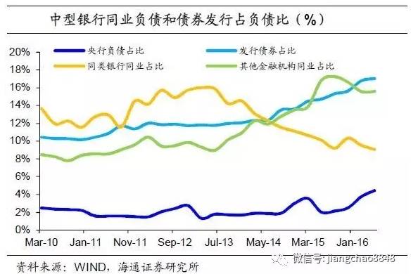 而中型银行方面,截止16年6月末,中型银行的同类同业负债占比10%,其他同业负债的占比为15-16%,债券发行占总负债的比例为16-17%,则银行同业负债+非银同业负债+同业存单占总负债的比例明显超过33%,表明如果同业负债纳入同业存单,16年扩张较激进的股份行和城商行在17年将面临较大的去杠杆压力。
