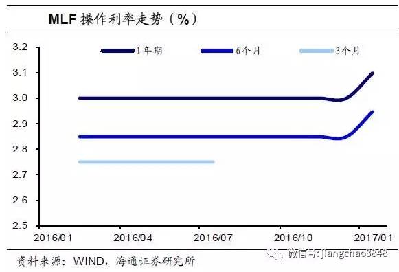 17年1月份央行上调MLF、OMO、SLF利率也是金融去杠杆的体现,通过利率走廊上浮来影响资金成本。1月24日,央行继推出TLF后,上调6个月和1年期MLF利率10bp分别至2.95%和3.1%,2月3日,接连上调逆回购和SLF利率,金融去杠杆是本次利率上调的主因,同时防止信贷投放过度。