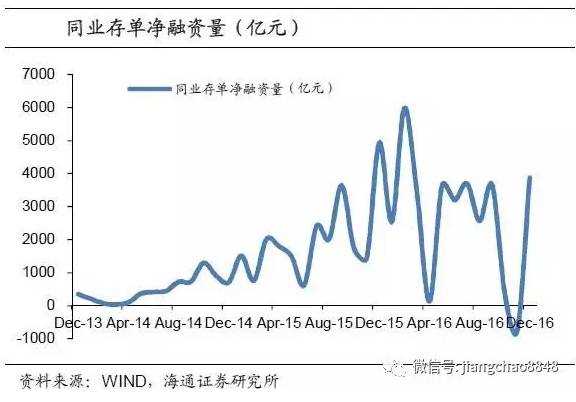 而银行理财对接委外的模式,也使得银行负债端的非银存款规模大幅增加,截至16年12月末,非银存款存量规模12.7万亿,对比15年初的8.8万亿,16年全年都维持在较高规模。