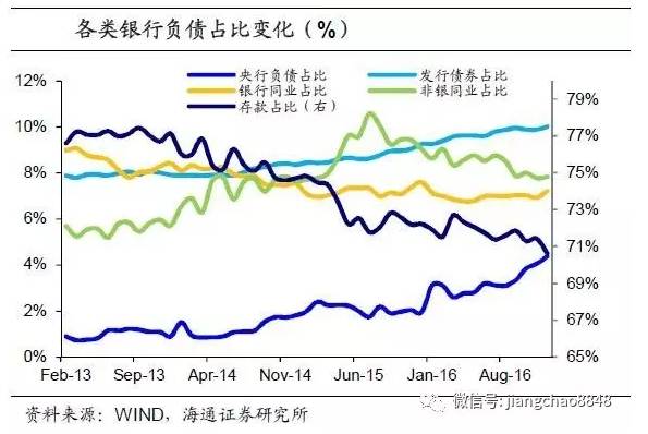 另一方面,从银行负债端看,由于存款向理财转移,存款占银行负债的比例从14年的75%下滑至16年的70%,银行通过发行债券、银行和非银同业等方式主动负债,支撑资产端的扩张。