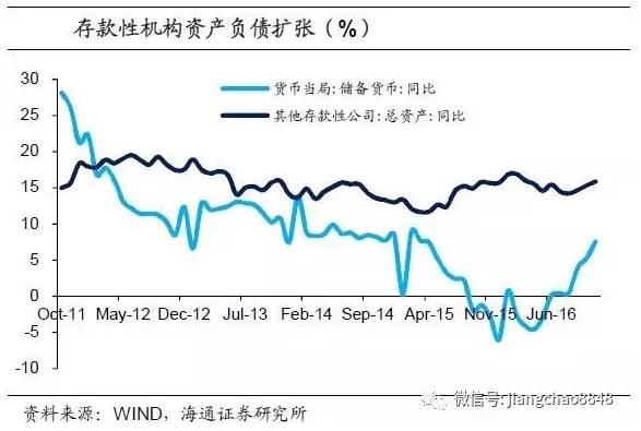 数据显示,14年以来,我国银行总资产同比增速持续在10%以上,15年更是显著扩张、增速达到17%,16年也维持在15%以上。但是因为外汇占款下降,货币当局的储备货币却反而减少,15年下半年到16年上半年,货币当局基础货币增速一度为负。