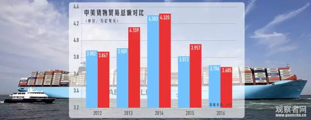 2016年美国的货物贸易总额达到3.706万亿美元,中国为3.685万亿美元。美国的进出口额均同比减少3%。中国的出口额同比减少8%,进口额减少5%,进出口额的减幅都大于美国。中国未能保住2013年赶超美国而夺得的全球贸易额首位宝座。