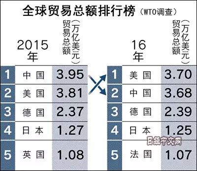 WTO的最新数据显示,持续三年世界第一之后,2016年全年我国的进出口贸易额被美国反超。