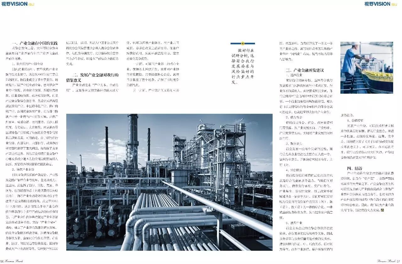 开展产业金融,可以依托所建立起来的优质基础客群,推动行业整合,并进一步挖掘,实现价值增值。近期,党中央、国务院下发了《关于深化投融资体制改革的意见》,可以预见,在不远的将来,银行业投贷联动将大行其道,产融结合将创造出更大的市场价值。