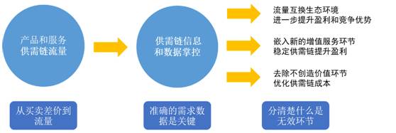 实体产品或服务的交易供需链流量,是盈利的一切基础。由于互联网对信息对称的空前变化,造成了企业越来越不再依赖于简单价差获取利润,而是依据产品的流动带来的供需链流量,在整体价值链中寻找增值服务的利润。