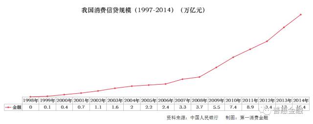 据央行数据,我国消费信贷规模稳健增长。据央行统计,我国消费信贷规模由1997年的172亿元增加到了2014 年的15.4万亿,增长了895倍。
