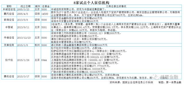 8家试点个人征信机构,有4家在北京,3家在深圳,1家在杭州。从成立时间来看,2家成立于2005年,分别为中诚信征信和鹏元征信,这两家出身均与央行有关;3家成立于2013年;3家成立于2015年。8家个人征信机构注册资金均不少于5000万元。