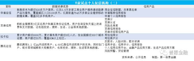 据国务院2015年1月5日发布的公告,央行印发了《关于做好个人征信业务准备工作的通知》,要求芝麻信用、腾讯征信、中诚信征信等八家机构做好个人征信业务的准备工作。此举意味着,以上八家或将首批获得个人征信牌照。