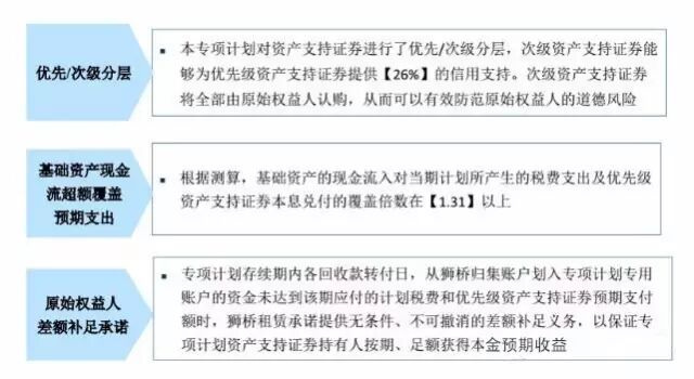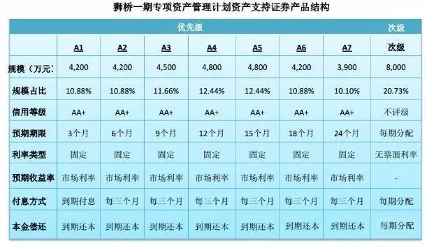 狮桥一期的基础资产包括狮桥拥有的重卡、工装和农机业务部门下签署的《融资租赁合同》、《售后回租合同》所依法享有的应收融资租赁债权及其从权利。该计划管理人和推广机构均为长江证券股份有限公司,托管人为兴业银行。狮桥一期分为优先级和次级两档,其中优先级资产支持证券为3.82亿元,分为狮桥一期收益01-07七档,其信用由大公国际资信评估评级均为“AA ”。其中“狮桥一期收益01” 期限为3个月,预期年化收益率6.8%。次级资产支持证券为1亿元,由原始权益人全部认购。且狮桥对该计划优先级证券预期收益和本金提出了差额补足承诺。