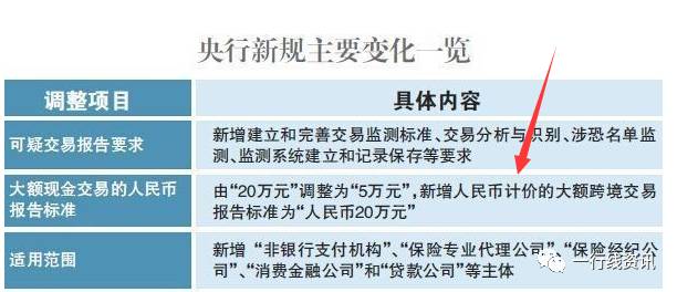 该管理办法将大额现金交易的人民币报告标准由20万元调整为5万元。以人民币计价的大额跨境交易报告标准为人民币20万元。对跨境资金交易,金融机构应当报送大额交易报告。