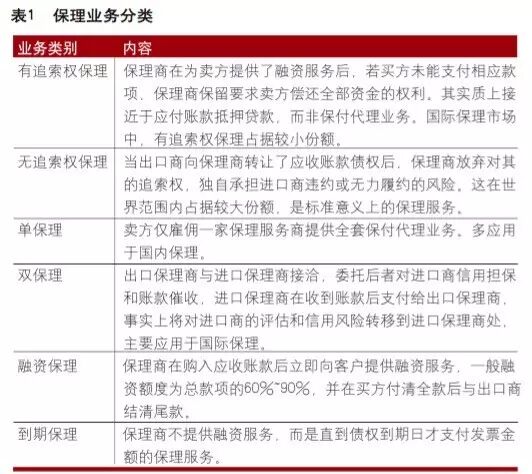 按照保理服务内容分类,可以分为有追索权保理、无追索权保理、单保理、双保理、融资保理、到期保理六大类(表1)。