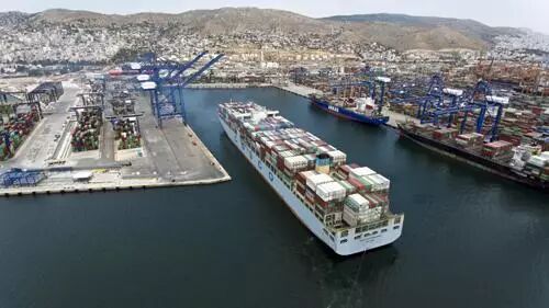 资料图片:2017年5月7日,中远海运的货船驶出比雷埃夫斯港集装箱码头。
