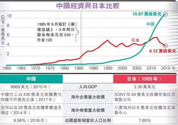 然而,《金融时报》认为两国在很多方面难作比较。经济历史学家一般认为日本泡沫经济是由1985 年9 月的《广场协议》触发。该协议为美元贬值开绿灯,3 年间日圆由每美元兑240,升至120。相比下,中国一直严控货币波幅,打击投机行为,甚至在2015 年7 月出手挽救股市。另一个显著区别是经济的抗跌能力。日本在1990 年代初楼价崩跌后,一直缺乏新的经济引擎来带动经济摆脱困境。里昂证券的分析则认为,中国的规划经济采取了日本当年未曾尝试的策略,就是将出口驱动模式,转向消费驱动模式。