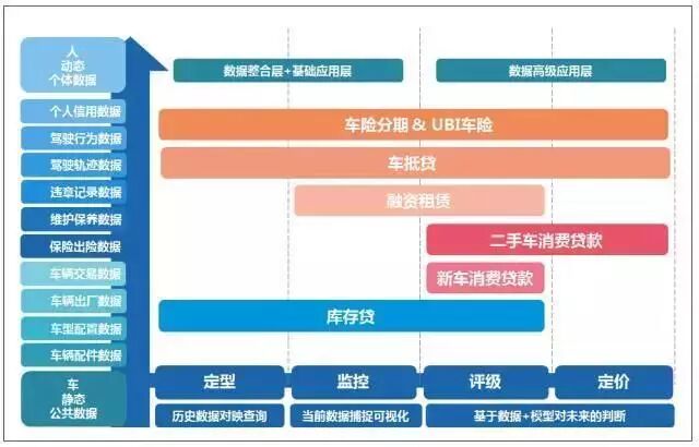 从纵向所需要的数据源看,完整严谨的车抵贷交易需要在贷前查询车型配置数据,车辆出厂数据,车辆交易数据,保险出险数据,维护保养数据,违章数据,个人信用数据,在贷中持续监控驾驶轨迹数据以及出险,维护保养,违章等数据。