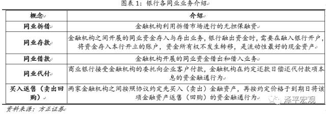 根据人民银行、银监会、证监会、保监会、外汇局2014年联合出台的《关于规范金融机构同业业务的通知》,银行同业业务是指“中华人民共和国境内依法设立的金融机构之间开展的以投融资为核心的各项业务,主要业务类型包括:同业拆借、同业存款、同业借款、同业代付、买入返售(卖出回购)等同业融资业务和同业投资业务”。每种同业业务定义如图表1所示。