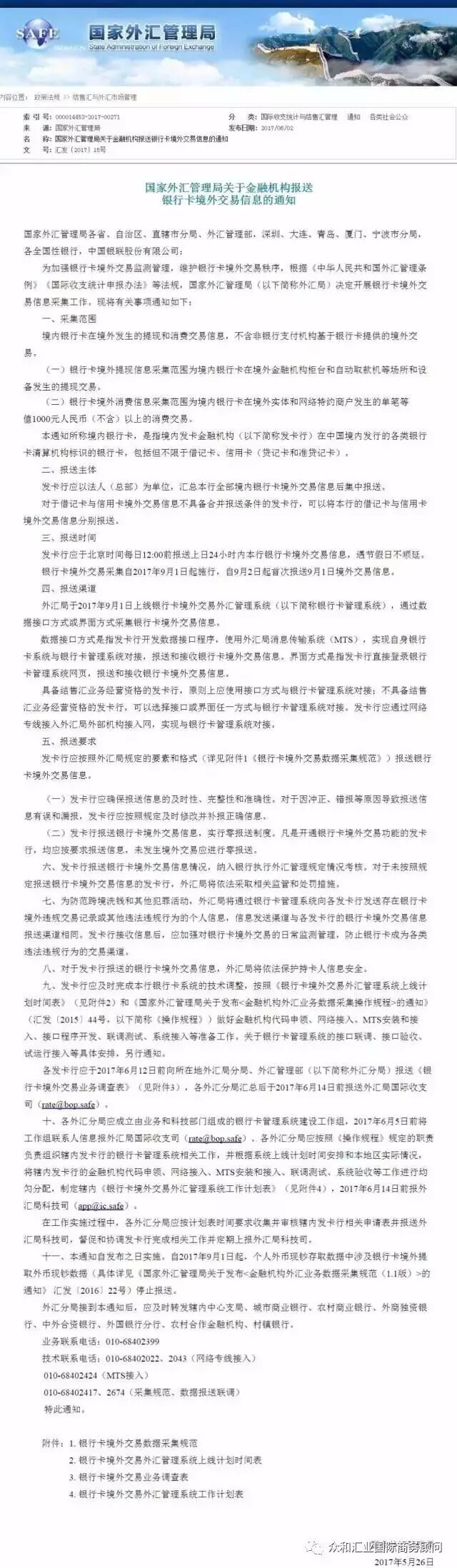根据国家外汇管理局发布的《国家外汇管理局关于金融机构报送银行卡境外交易信息的通知》,通知规定自2017年9月1日起,境内发卡金融机构向外汇局报送境内银行卡在境外发生的全部提现和单笔等值1000元人民币(不含)以上的消费交易信息。