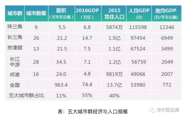 占国土面积11%的五大城市群经济总量占全国55%,是中国经济最活跃,潜力最突出的地区。