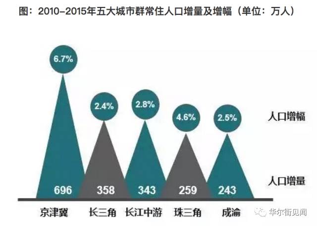 京津冀城市群受益于北京、天津两大城市人口的快速增长,五年常住人口增加近700万,人口凝聚力居首;