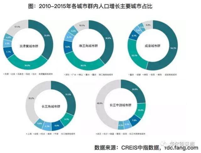 2、从人口增量来看,京津冀、珠三角、成渝都是双核驱动的城市群,城市群内两大核心城市人口增量占比均超过整个城市群的六成。