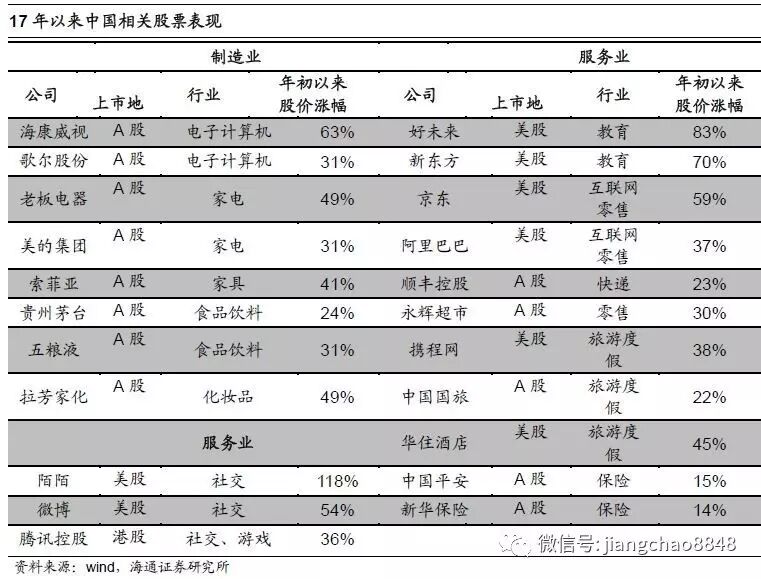 从工业投资到服务消费。最后从今年以来中国相关资产在全球的表现来看,表现好的资产主要可以归功于两大类,一是和消费有关,比如家电、家具、食品饮料、化妆品等;二是和服务业有关,比如社交、教育、互联网零售、快递、旅游度假、保险等等,这意味着中国经济正在从工业投资向服务消费转型,服务和消费类资产是未来希望所在。