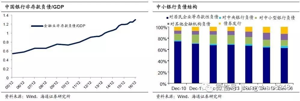 金融加杠杆、危险的游戏。但随着中国银行负债结构从存款转向金融市场借款,其实使得整个中国金融体系出现了巨大的风险。过去中国银行的负债以存款为主,而存款相对比较稳定,所以哪怕在98年中国银行体系的一半资产都变成了坏账,但是只要大家对政府有信心,不是同一天去银行提款,就不会发生任何危机。但16年中国金融业非存款负债已经超过GDP,中小银行的非存款负债已经占到其总负债的1/3,由于同业存单期限较短,一般都不超过3个月,意味着许多金融机构靠每天融资才能存活,万一哪一天借不到钱就会引发金融风险。