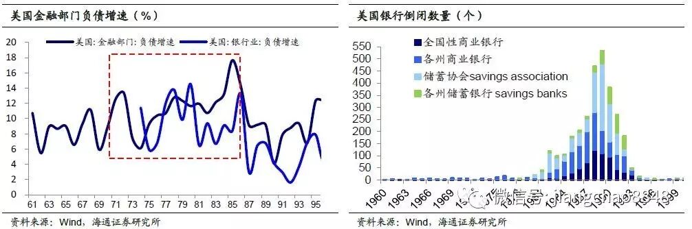 金融部门扩张过度,储贷危机。在80年代,美国金融和银行部门的负债高速扩张,推动了地产行业的繁荣,但好景不长,随着美联储加息刺破地产泡沫,美国银行倒闭数量激增,出现了储贷危机。