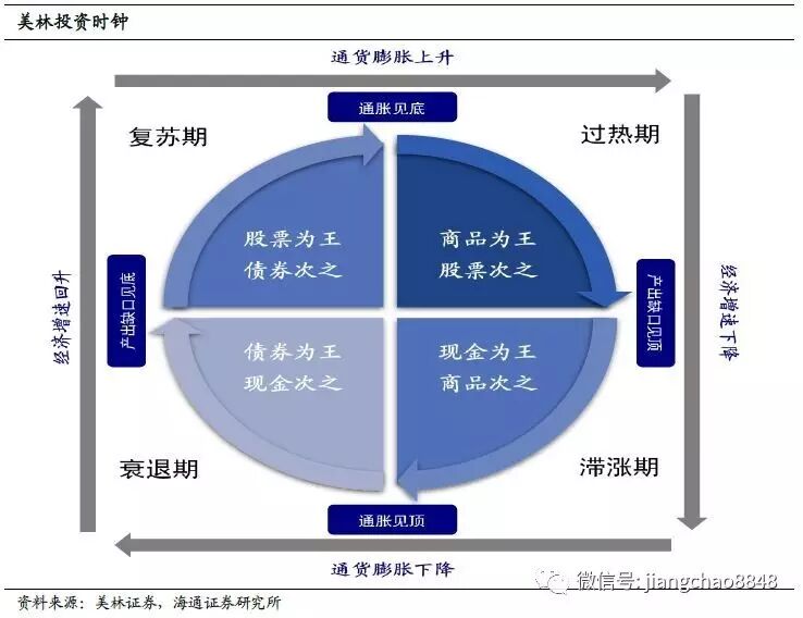 短期现金为王,布局未来资产。融资增速回落,经济前高后低。17年3月,全社会包括政府融资总量同比下降6500亿,降幅创15年4月以来新高,而4月融资同比仍降,这意味着下半年经济存在较大下行风险。17年下半年,存货周期应已结束,地产投资或面临大幅跳水,而去杠杆将传导进实体经济,届时经济下行风险将明显增加。投资时钟停摆,短期现金为王。17年以来,现金收益率大幅上升,经济步入滞胀期,源于央行货币紧缩,经济开始减速,现金为王是短期主要策略。现金并不是纯粹的持币,而是配置货币类资产,而今年持有现金的机会成本有限,也可以借着市场回调的机会,布局中国的优质资产。债市等待机会,股市布局未来。债券类资产仍具备长期投资价值。与欧美日相比,中国10年期国债仍具有投资价值,且当前国债利率高企,主要源于金融去杠杆导致的被动抛售,因而仍具备长期投资价值。股票市场则寻找结构性机会。一是聚焦有全球竞争力、定价权的中国制造业公司,将受益于海外复苏,比如家电龙头;二是寻找技术创新、进口替代空间巨大的行业,比如集成电路、新能源、汽车、飞机等;三是传统周期性行业,或是民企占比高,实现剩者为王,比如水泥、化工,或是政府主导僵尸行业并购整合,实现瘦身健体;四是金融业大浪淘沙,主动收缩业务、压缩杠杆的银行将率先从危机中复苏;五是消费、服务业相关行业,中国经济正从工业投资向服务消费转型,服务和消费类资产是未来希望所在。