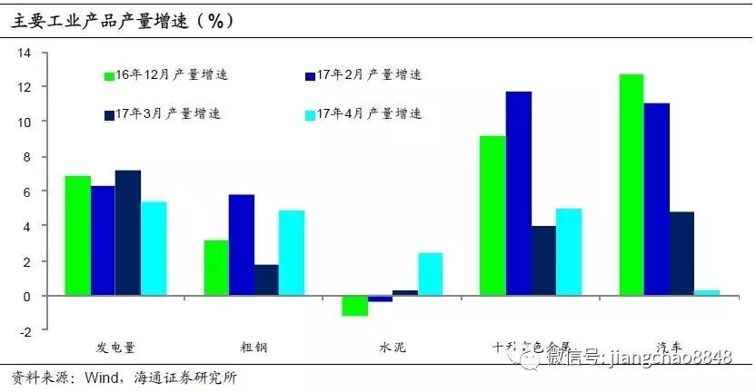 总量指标高位回落。统计局公布17年1季度GDP增速达到6.9%,创1年半反弹新高,而3月份的工业增加值增速也跳升至7.6%的高位,但4月工业增速降至6.5%,出现明显回落。