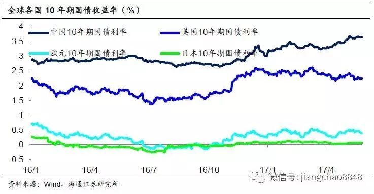 等待债市机会。首先是债券类资产,尤其是无风险的利率债。从目前主要经济体的10年期国债利率水平看,中国在3.6%,美国只有2.3%,欧元区0.4%,日本只有0.05%,所以相比较而言中国的10年期国债最具有投资价值。而且和美国相比,其加息周期下长期国债利率不升反降,反映经济处于弱复苏状态。而当前中国经济通胀开始下行,而国债利率仍处过去几年的高位,源于金融机构去杠杆导致的被动抛售,其实意味着国债利率具备长期投资价值。而今年以来国内保险股的上涨,其实反映的保险作为负债期限最长的机构可以配置更高收益的债券,从而获取更高收益。