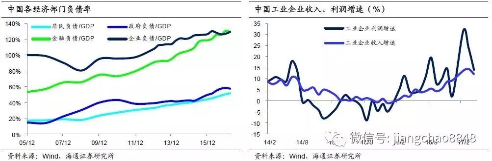 中国去杠杆:先经济后金融,企业利润改善。但从中国过去两年的实践来看,得益于供给侧改革的推进,从16年初开始实体经济中的企业部门率先开始去杠杆,并带来了企业利润的改善,而从17年初才开始金融部门的去杠杆。这意味着中国并非不去杠杆,而是去杠杆顺序与欧美有明显差异,我们是先去实体经济的杠杆,在大幅改善了钢铁、煤炭等落后产业的盈利之后,再开始去金融领域的杠杆,同时政府部门还在加杠杆对冲,这样就不会引发严重的失业问题,也意味着金融去杠杆可以加大力度推进。