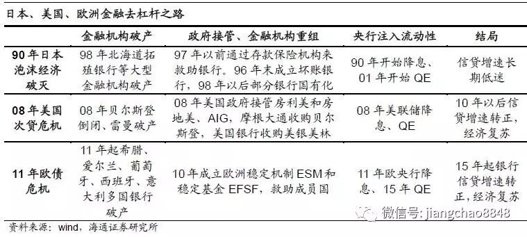 金融去杠杆终极目标:银行破产重组。另一个方式是债务减记,也就是放开金融机构的破产。从日本、美国、欧洲先后处理金融行业危机的经验来看,美欧从金融危机中的复苏都经历了银行倒闭、政府救助,利率下降,然后经济复苏的过程,但是日本迟迟不愿放开银行倒闭,也就错失了救助银行的时间,以致于利率下降都收效甚微。所以去杠杆的终极目标是放开银行破产,给银行业足够的教训,改变银行只会向地产放贷的行为。