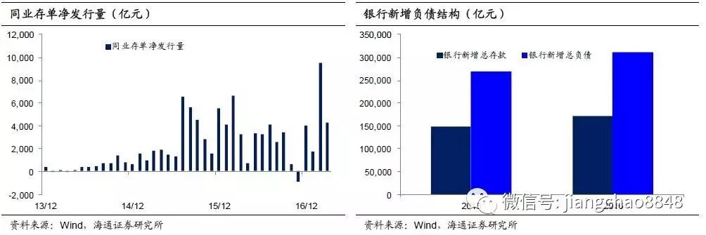 融资转向同业市场。比如说同业存单和同业理财的兴起,意味着商业银行开始向金融机构借钱,其好处在于一是可以突破存款准备金率的约束,无限制地创造货币,比如17年2月份单月同业存单净发行达到了1万亿。另一个好处是可以突破地域的约束,很多中小银行可以利用同业市场向全国的金融机构举债。从整个银行体系来看,过去两年的新增负债中只有一半是传统的存款,另外一半来自金融市场,主要是向央行和同业的借款。