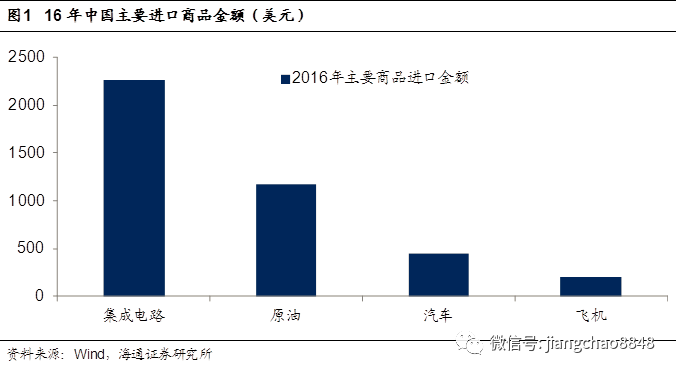 技术创新,进口替代。二是寻找技术创新、进口替代的机会。目前中国已经是全球第一大的汽车和手机市场,第二大航空市场、原油消费国,而在这些领域中国存在着大量的进口,16年光集成电路的进口金额就达到2200亿美元,原油进口额1165亿美元,汽车相关进口447亿美元,飞机进口204亿美元,这意味着包括集成电路、新能源、汽车、飞机等产业存在巨大的技术创新和进口替代的机会。