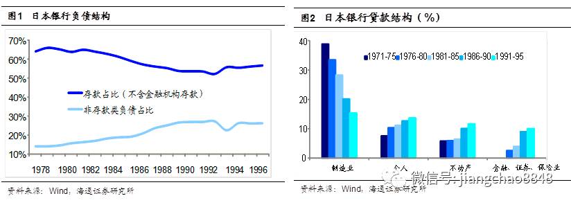 日本利率市场化:银行追逐地产。日本利率市场化从70年代开始,到90年代中期完成,在80年代开放了可转让存单和货币市场存单,期间商业银行主动增加非存款负债,同时其信贷资产持续向房地产和居民倾斜,而其投向信托和保险业的信贷也间接投向了房地产,最终导致了地产泡沫。