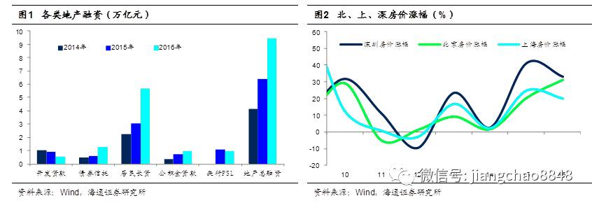 货币超发、泡沫之源。从货币的角度来看,本轮房价上涨源于影子银行大发展,导致货币严重超发,远超经济增长需要,从而推动了房价上涨。银行一方面通过贷款、非标、债券借钱给地产企业拍地,另一方面贷款给居民买房,而银行又通过金融市场大规模举债来支撑这些借贷,就使得货币创造失控、地产泡沫越滚越大。我们统计去年开发贷款、债券信托、居民房贷和公积金贷款、央行PSL合计提供约10万亿地产融资,15、16连续两年地产总融资增速超过50%,这也使得本轮房价涨幅远超以往。