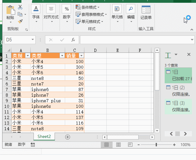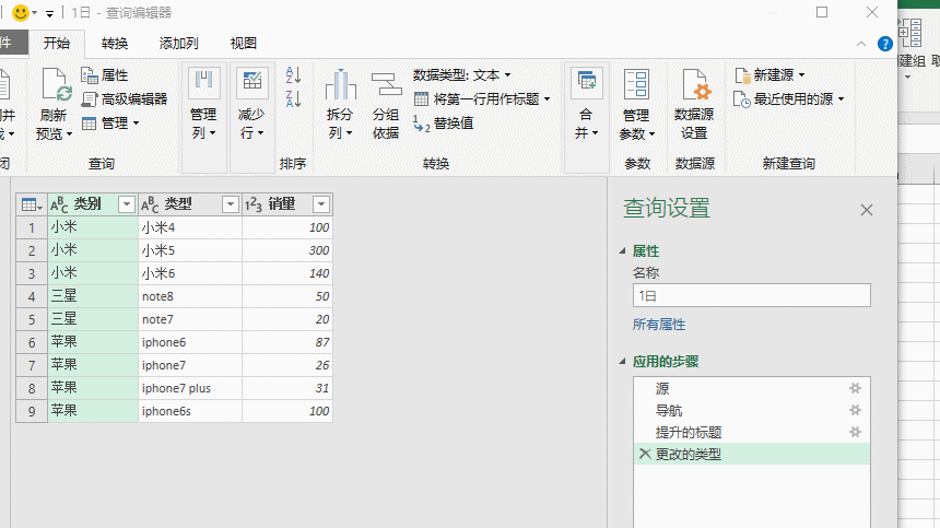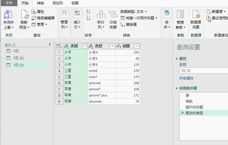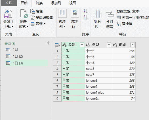 开始 - 合并 - 追加查询,在北京的数据(1日)后追加上海、广州的日报数据