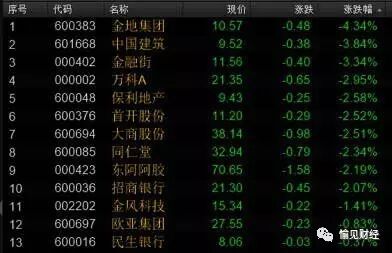 可以看到,跌幅最大的为“金地集团”,下跌4.34%,位于其后的是“中国建筑”和“金融界”,跌幅分别为3.84%和3.34%。