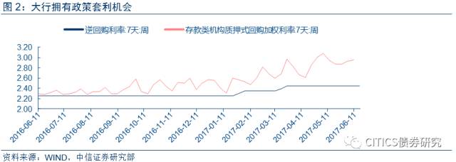 在央行当前的货币政策下,众多大中型银行作为一级交易商,有资格直接从央行获得货币政策工具提供的流动性以保证自身的流动性充裕,如七天逆回购的政策操作利率为2.45%,而存款类机构银行间质押式回购利率(DR007)目前为2.9%左右,也就是说,通过拆借资金,流动性充裕的大行可以获得无风险的政策套利机会。