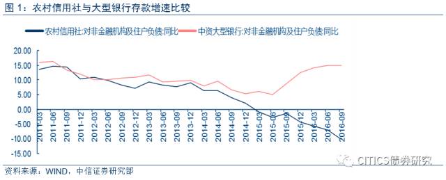 近年来,农村信用社存款余额同比增速不断下降,自2015年一季度起,农村信用社存款增速同比甚至变为负数。而与此同时,我国M2余额同比仍在不断增加,大中型银行的存款余额也在稳步提升。这种分歧使得小型银行不得不通过同业业务、表外业务来扩大自身资金规模,以保证业务的发展。