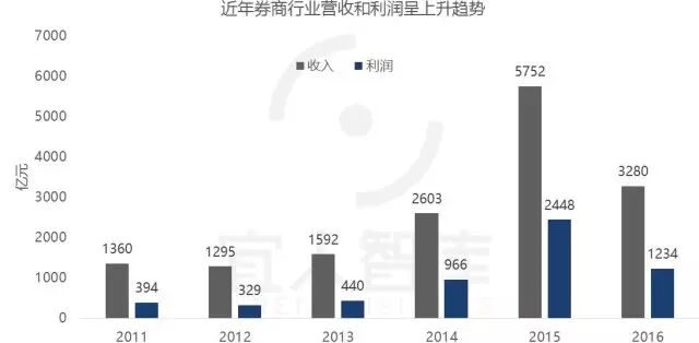 全行业129家证券公司2016年全年实现营业收入3,279.94亿元,实现净利润1,234.45亿元,124家公司实现盈利。截至2016年底,证券公司行业总资产为5.79万亿元,净资产为1.64万亿元,净资本为1.47万亿元,客户交易结算资金余额(含信用交易资金)1.44万亿元,托管证券市值33.77万亿元,资产管理业务受托资金总额17.82万亿元。 预计证券公司资管业务未来仍将保持快速发展。2016年各主营业务收入分别为代理买卖证券业务净收入(含席位租赁)1,052.95亿元、证券承销与保荐业务净收入519.99亿元、财务顾问业务净收入164.16亿元、投资咨询业务净收入50.54亿元、资产管理业务净收入296.46亿元、证券投资收益(含公允价值变动)568.47亿元、利息净收入381.79亿元。