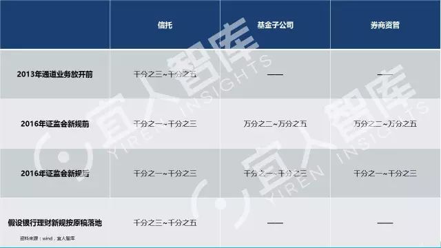 信托资产余额破20万亿,增速有望反弹。根据中国信托业协会数据显示,2013-2015年,信托业务遭遇基金子公司等资管公司的激烈竞争,信托资产余额同比增速逐年下降,分别为46%、28.2%和16.6%。截至2016年末,我国信托资产余额突破20万亿元,信托资产的持续增长反映了实体经济融资需求仍然较为稳定,中国经济增长的韧性仍强。政策刺激和PPP等实业投资机会将推动信托资产增速反弹,预计2017-2019年信托资产规模增速分别为15%、18%和20%。 基金子公司和券商资管通道费率已无优势。由于监管层对于券商资管和基金子公司风险准备金计提从严,券商资管和基金子公司逐步失去通道费率的相对优势。证监会多项新规出台后,基金子公司和券商资管的通道费率已与信托相差无几。若未来银行理财新规按7月27日的征求意见稿落地,则银行理财只能对接信托计划,通道费用或回升到2013年之前的水平。