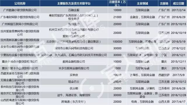截至2017年5月26日,根据公开资料统计,全国共有129家互联网小额贷款公司(含2家已获地方金融办批复尚未工商注册),64%的公司有上市公司背景。这之中,7成以上公司的主体涉实业领域,分布在商贸物流、汽车、房地产、建筑、建材家居等行业,纷纷抢滩的,还有腾讯、阿里、百度互联网巨头,以及互联网金融新贵。