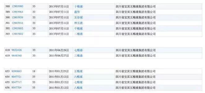 五粮液不会给其他人机会,六粮液、七粮液、八粮液、千粮液都已经是他的了。为了保险起见,二粮液、二粮春、十粮春……都得一网打尽!图:五粮液注册的部分商标(图片来源:商标局)