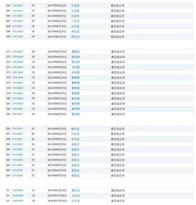 相比可口可乐,星巴克注册起商标来,可能翻遍了新华字典:星巴客、巴克星、巴星克、辛巴克、辛巴客、新巴特(绝佳的相声练习题材)……只有你想不到,没有他做不到的。图:星巴克注册的部分商标(图片来源:商标局)
