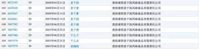 作为中国人人情世故文化的重要方面,非亲情的维系,通常要通过干爸干妈作为纽带。嗯,我们有老干妈陶华碧了,但这显然还不够,有了老干爹,老干妈才不孤独;当然,老干爹老干妈,你也可以喊成老干爸、老干娘,这要看你的心情和你们当地的习惯;此外,关系是对等的,有干爹干妈,就有干儿子、干女儿。图:老干妈注册的部分商标(图片来源:商标局)
