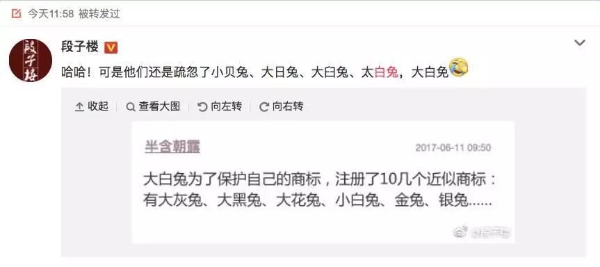 近日,有一条微博火了。有网友说:大白兔为了保护自己的商标,注册了十几个近似商标:大灰兔、大黑兔、大花兔、小白兔、金兔、银兔……