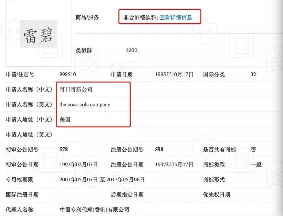 由于山寨产品取名、选择包装的脑洞开得实在太大,正牌商家往往猝不及防。被逼无奈,这些正牌商家采用了“以牙还牙”的策略——先抢注一批商标,让投机者无漏洞可钻。于是,你就能见到如下滑稽的场景:模仿“雪碧”的“雷碧”,模仿“星巴克”的“星巴客”,模仿“娃哈哈”的“哇哈哈”……这些品牌其实并不是山寨,而是大家所熟悉的那家公司注册的。图:“雷碧”商标已被可口可乐注册(图片来源:商标局)