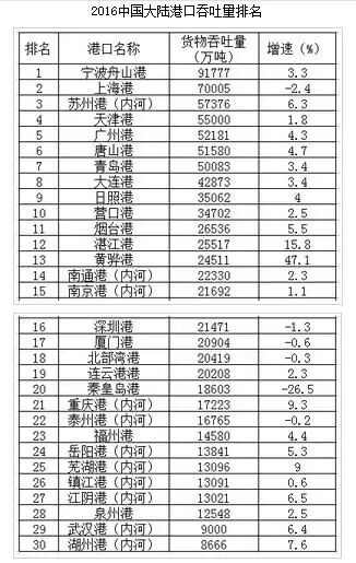 2016年,宁波舟山港年货物吞吐量突破9亿吨,成为全球首个“9亿吨”大港,以超过2亿吨的绝对优势,继续稳居中国乃至全球第一大港口宝座。上海港在2016年完成了7亿吨的货物吞吐量,但也是中国大陆前15大港口中,唯一呈现负增长的港口。由张家港港区、常熟港区和太仓港区组成的内河港——苏州港是今年的第一匹“黑马”,以6.3%的增速在中国大陆前十大港口中排名第一,成功超越天津港,跻身前三。