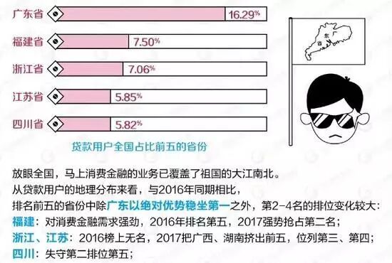 从2016年排名前五的广西、湖南在2017年被浙江、江苏代替,也说明了近年来消费金融属于快速增长期,地区用户数据你追我赶。但是,整个市场属于爆发初期,距离形成稳定的行业也格局还有很大的空间。
